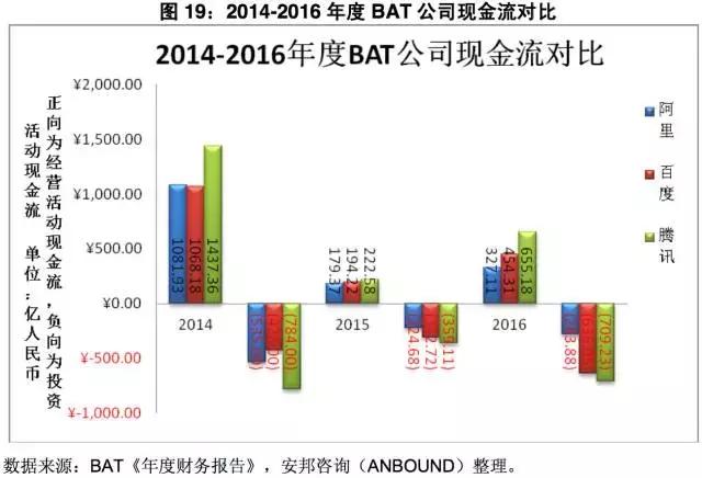 从现金流情况看,三家企业的经营性净现金流在2015年都出现了较大程度的下降,2016年又有所好转,能否继续保持这种回升走势还有待2017年年终最后揭晓。2014-2016年,BAT由投资活动产生的净现金流均为负值,说明大量的投资并购活动占用了资金而许多都未能及时回收,从而对正常生产经营活动所需要的资金也产生了一定程度的影响,特别是2015年投资并购高潮阶段使经营活动所产生的净现金流出现了大幅下滑现象。