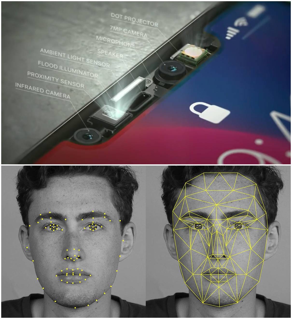 在 iPhone X 的小刘海上,集成了多个传感器、投影器及两个摄像头。Face ID 由 TrueDepth 摄像头启用。看似简单的解锁方式,其实在识别的数秒内投影并分析了超过 30,000 个不可见的点,以创建一个精确的人脸深度模型图。