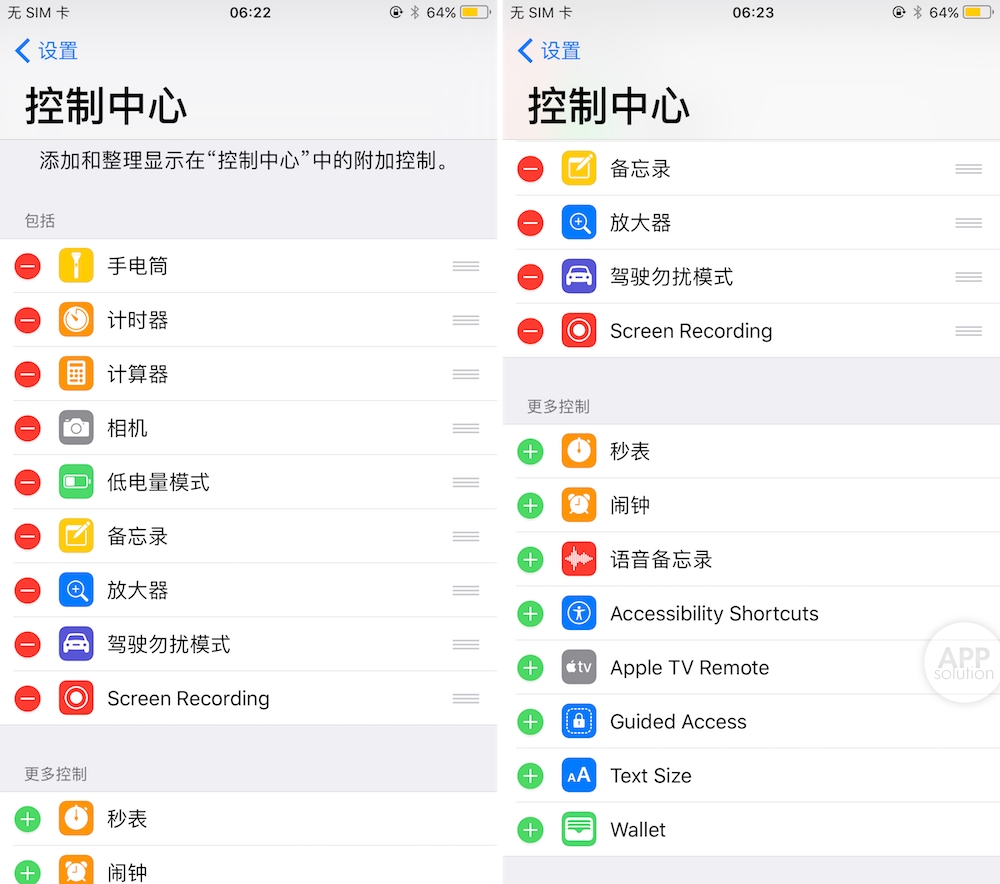 可以添加的功能一共有 17 种:手电筒、计算器、屏幕录制、相机、低电量模式、备忘录、放大器、辅助功能快捷键、计时器、驾驶勿扰、秒表、闹钟、文字大小、引导式访问、语音备忘录、Apple TV Remote 遥控器、Wallet。