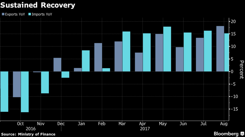 此次涨幅高过7月份的13.4%,同时也创下自2013年11月以来新高。分析人士说,这主要得益于汽车和半导体产品旺盛的海外需求。