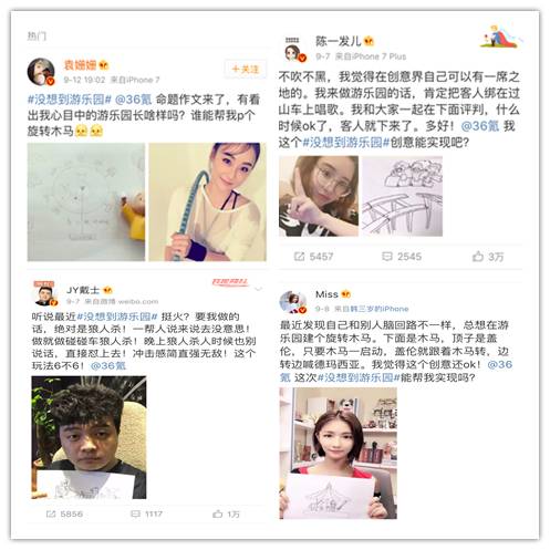 9月5日,36氪在其官方微博及官方微信公众号上同时公布“没想到游乐园”活动,同时借“13个你不得不来的理由”的经典互动活动吸引粉丝报名。