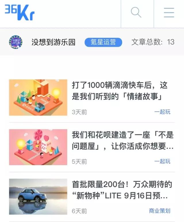 包括36氪在自身平台开设专栏“没想到游乐园”,发布共13篇文章,分别为滴滴快车、花呗LITE、红杉等合作文章,进行长达10天的宣传预热,持续保持活动话题的热度。