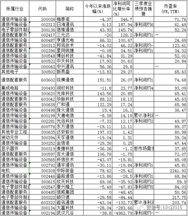 日海通讯是概念股中三季度业绩预增幅度最高的,其预告净利润为6300万元~6900万元,预增幅度为397.19%~444.55%,公司表示,预计下半年三大电信运营商(中国移动、中国电信、中国联通)和中国铁塔在通信网络基础设施的投资仍将维持高景气度,公司产品销售和通信工程服务的市场需求仍比较旺盛。公司作为通信网络基础设施解决方案提供商,主要为电信运营商提供有线宽带/光纤宽带网络建设解决方案及产品、移动宽带/无线站点建设解决方案及产品、通信网络的勘察、设计、施工及代维服务,公司的经营业绩受电信运营商和中国铁塔资本开支和建设节奏影响明显。