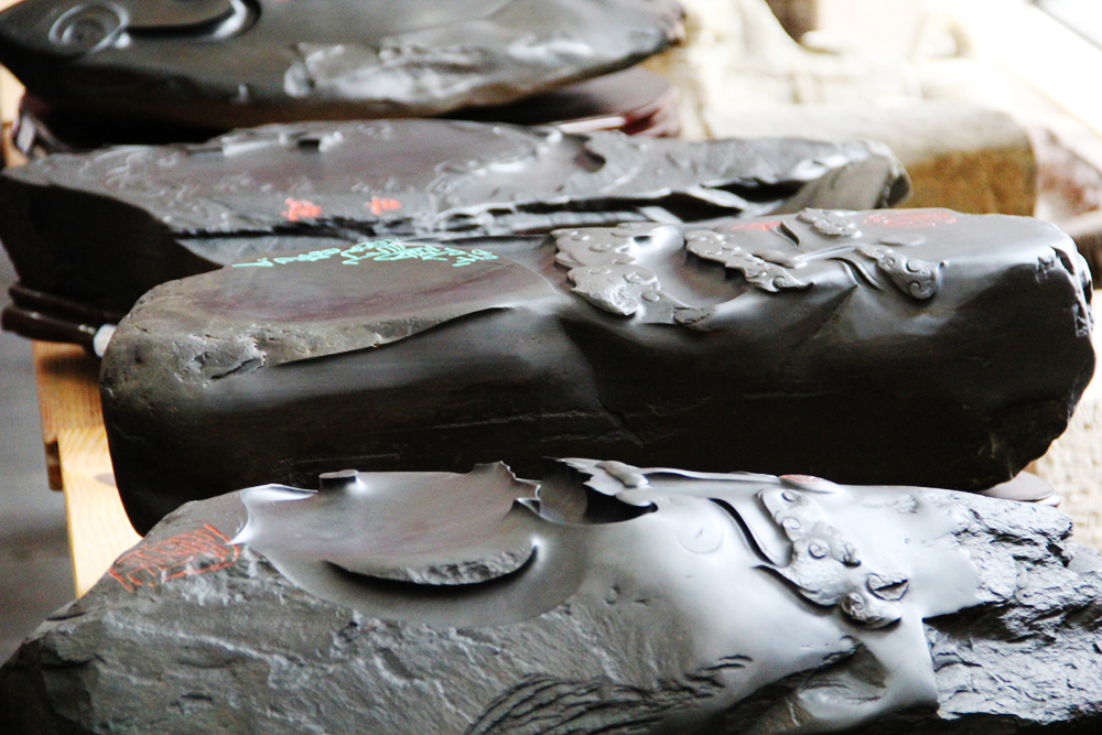 宣砚的雕刻讲求因石施艺,天然造化。雕刻师要根据石料的形状质地、颜色纹理,充分发挥自己的想象力,把人工美和石料天然美最大限度地结合起来。