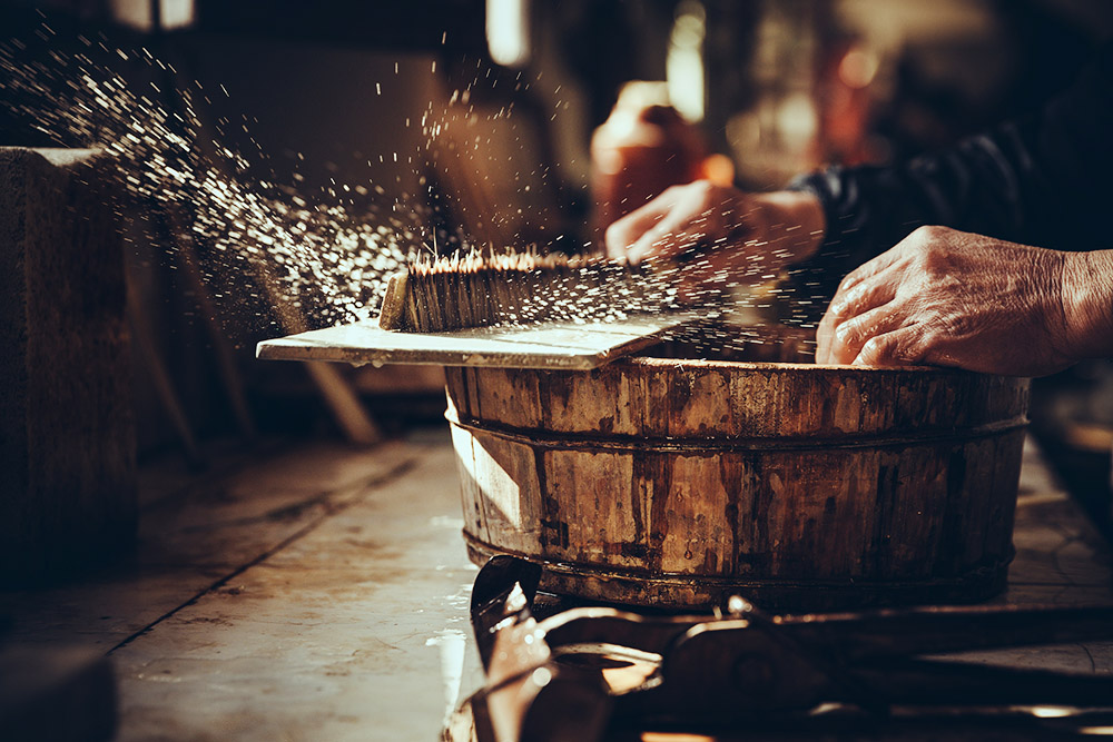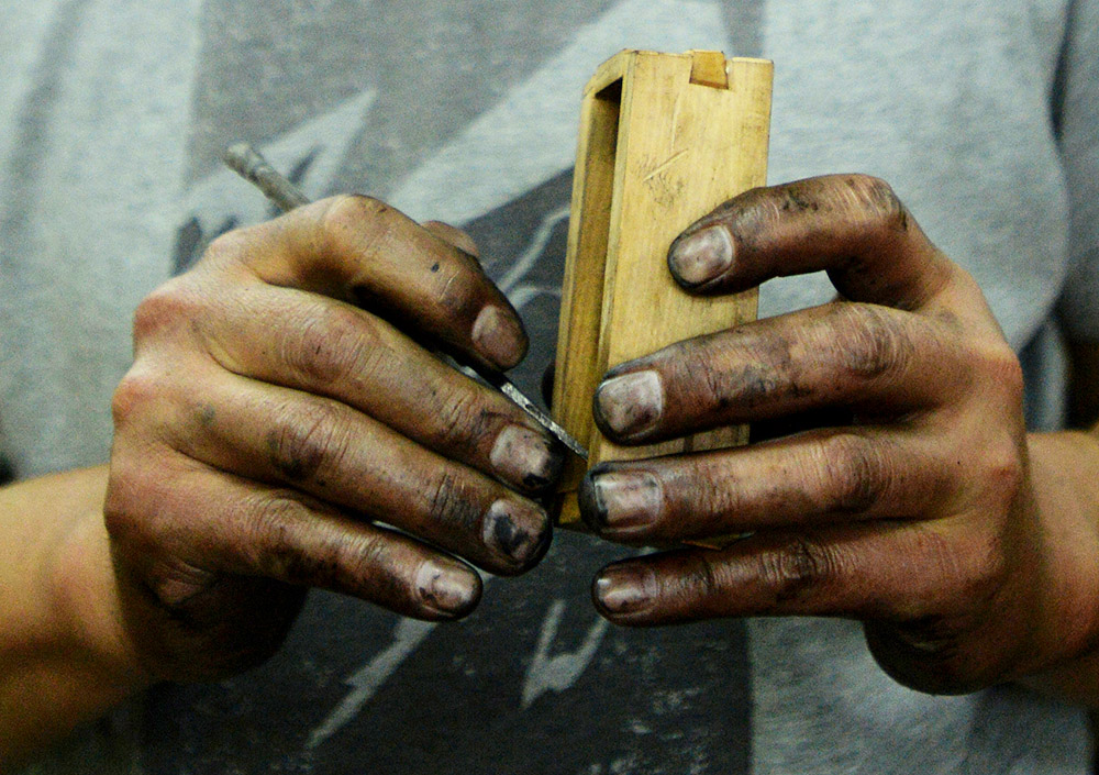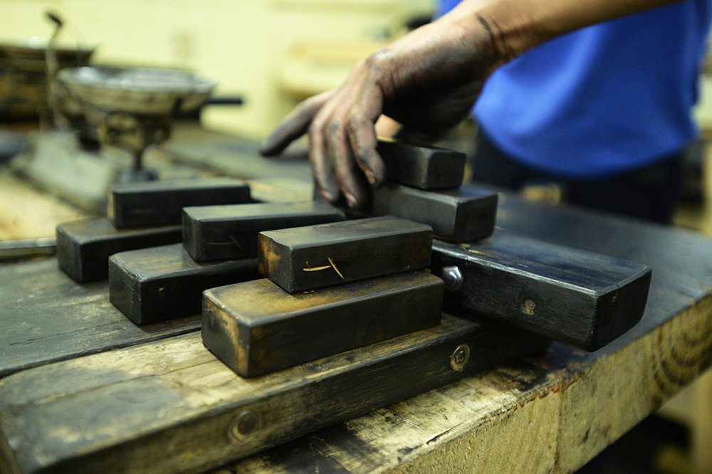 徽墨制作精美,相应的,其制作技艺也相当复杂,有20多道工序,炼烟、洗烟、熬胶、拌料、成坯、烘烤、锤打、定形、晾晒、打磨、描金、雕刻……每道工序都需静心凝神,再加上时间的等待,单晾墨阴干就需要6个月,制墨的过程也是历练人生的过程。