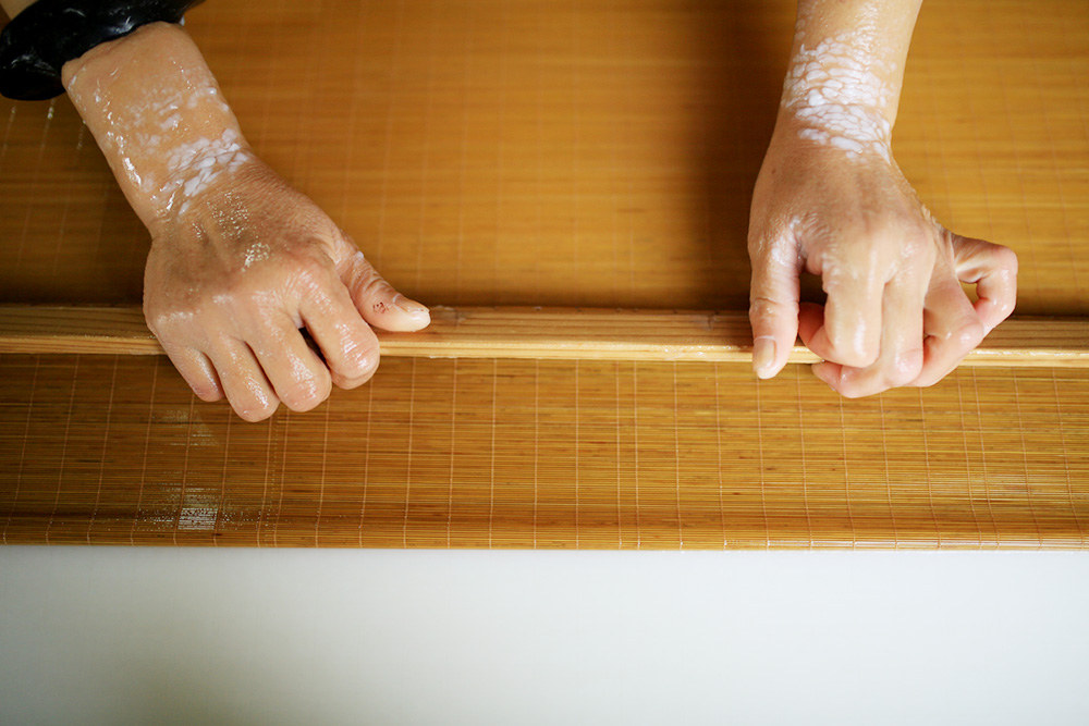 在纸帘上凝结的纸膜,被小心翼翼剥离。纸帘是用泾县特产的苦竹编制而成,这种细如发丝的竹帘,目前也只能由人工制作。