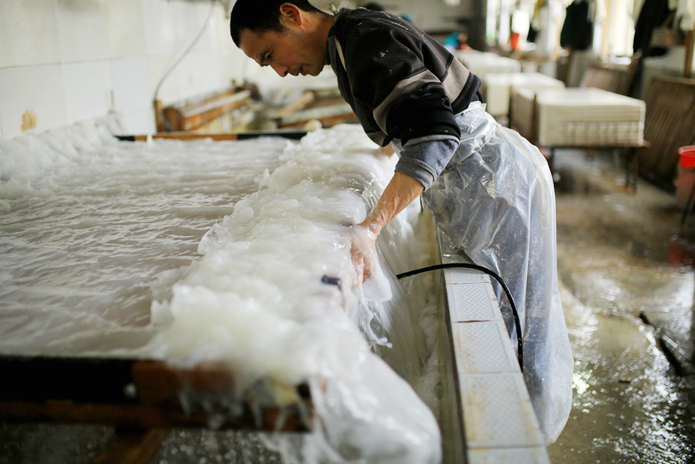 【宣纸】在宣城市泾县丁家桥镇,有一家规模不大的宣纸厂,至今沿袭着传统手法制作宣纸。发酵好的纸浆通过管道输送到车间,就是捞纸工作。在生产宣纸众多工序中,捞纸可谓是决定成败的关键。师傅把装有纸帘的木匣子往前一推,白色纸浆从管道中喷涌而出,不管春夏秋冬,工人们都是这样赤手操作。