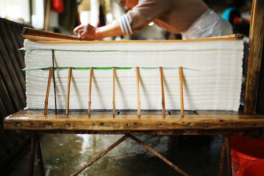 捞出的宣纸,500张左右为一沓,还要进行挤压,沥去水份。