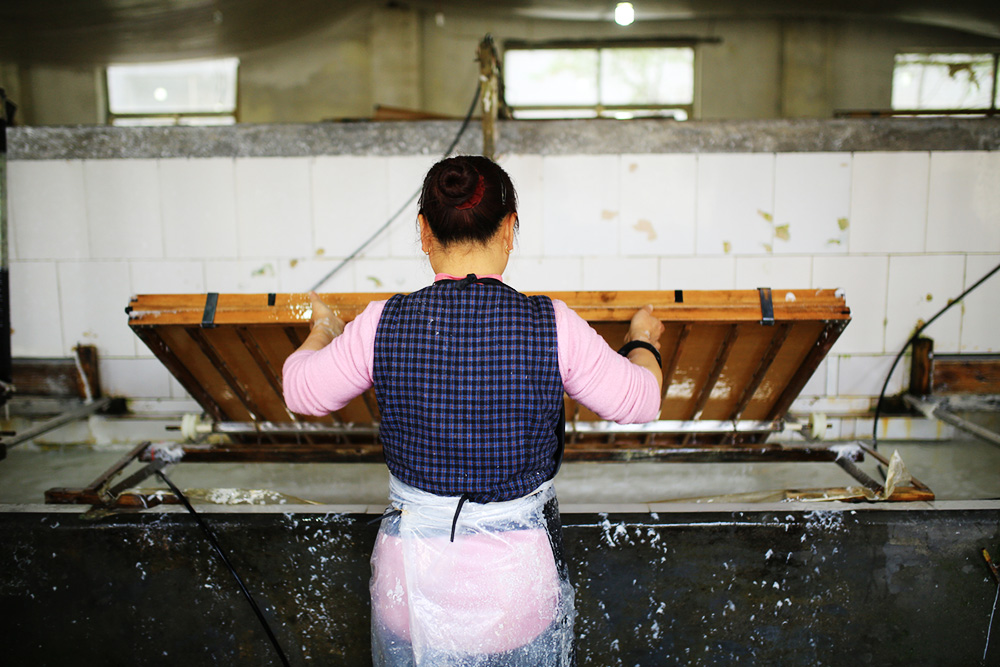 所谓“捞纸”,就是工人双手抬着纸帘在纸浆经过的水槽中来回晃动,一张湿润的宣纸便有了雏形,整个过程不过十几秒。