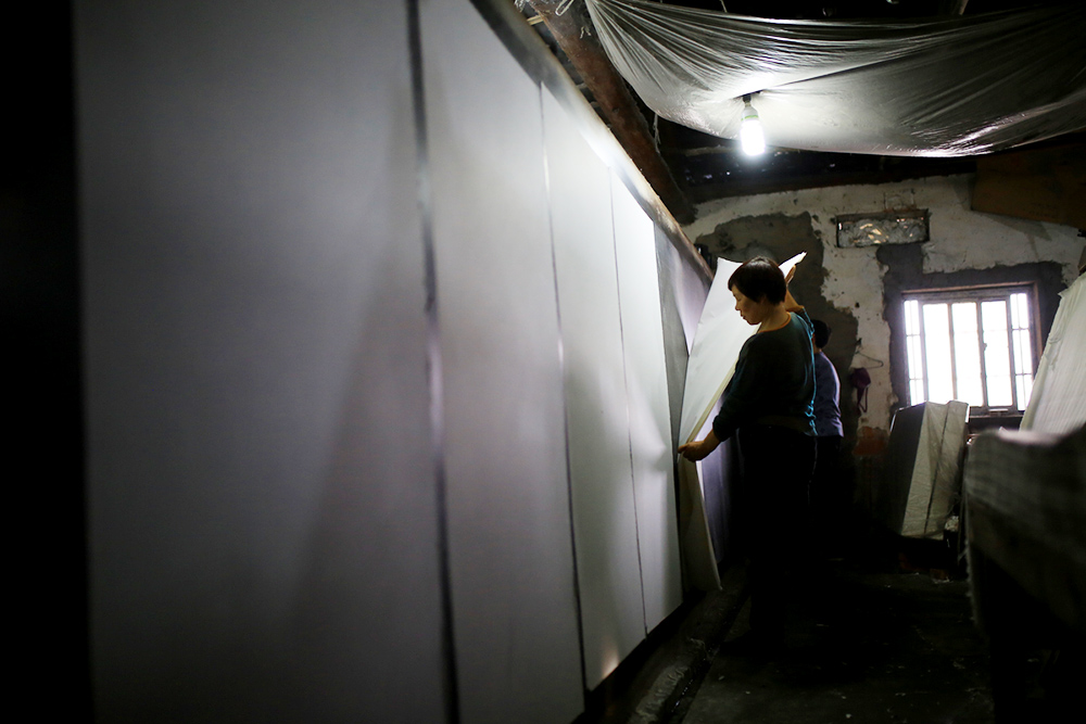这边是湿气扑面,而在另外一个车间,则是热浪袭人,里面矗立着几面用于晒纸的火墙,室温在50度左右,工人将初步沥干的宣纸,一张张剥开,贴到火墙上烘干。每张纸都要用松针刷细细抚平,辨别是否是手工宣纸的方法之一,就是看宣纸纸面上有没有松针留下的纹路。