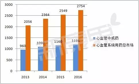 综合城市等级医院、县域等级医院、零售药店三大终端药品市场,中成药往县域机构下沉明显,2016年县域等级医院中,中成药占整个心血管药物市场的51.79%,中西药市场一分为二。