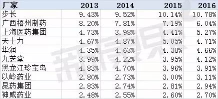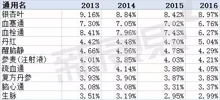 从单品种的市场份额排名来看,银杏叶蝉联第一,2016年在五大终端的市场份额为8.97%,增长率为6.48%。