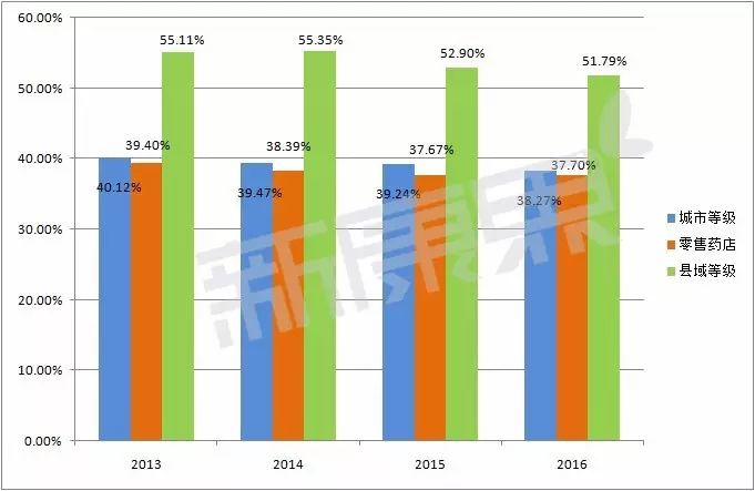 从2013-2016年,三大终端的中成药与心血管药物占比都在下降,零售药店和城市等级医院占比相当。4年的下降幅度分别为1.7个百分点和1.85个百分点。由于中药注射剂增长乏力,预计2017年,心血管中成药的市场份额将进一步下降。