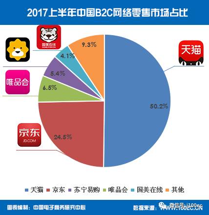 据中国电子商务研究中心监测数据显示,按GMV进行计算,2017上半年中国 B2C 网络零售市场(包括开放平台式与自营销售式,不含品牌电商),天猫排名第一,占50.2%份额,较2016年上半年下降了3%;京东名列第二,占据24.5%份额,同比上升了0.3%;唯品会位于第三,占6.5%份额,同比上升了2.7%;苏宁易购排名第四,占5.4%的市场份额,同比上升了2.1%,国美在线位列第五,占4.1%的份额,同比上升了2.5%。其他平台包括1号店、亚马逊中国、当当、聚美优品等B2C平台占据整个市场的9.3%份额。