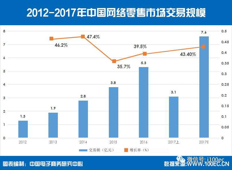 据中国电子商务研究中心(100EC.CN)监测数据显示,2017年上半年我国网络零售交易额达到3.1万亿元,与2016年上半年的2.3万亿元相比,同比增长了34.8%。