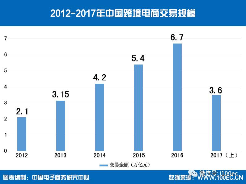据中国电子商务研究中心监测数据(100EC.CN)显示,2017上半年中国跨境电商交易规模3.6万亿元,同比增长30.7%。其中,出口跨境电商交易规模2.75万亿元,进口跨境电商交易规模8624亿元。
