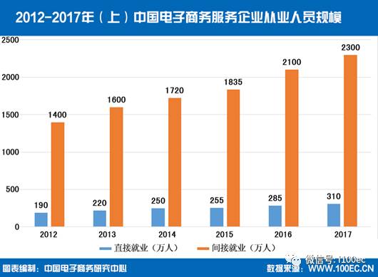 据中国电子商务研究中心监测数据显示,截止到2017年6月,中国电子商务服务企业直接从业人员超过310万人,由电子商务间接带动的就业人数,已超过2300万人。