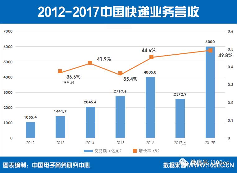 据中国电子商务研究中心监测数据显示,2017年上半年,中国快递业务营业收入为2572.9亿元,预计2017年年底将达到了6000亿元,预计增长率为49.8%。