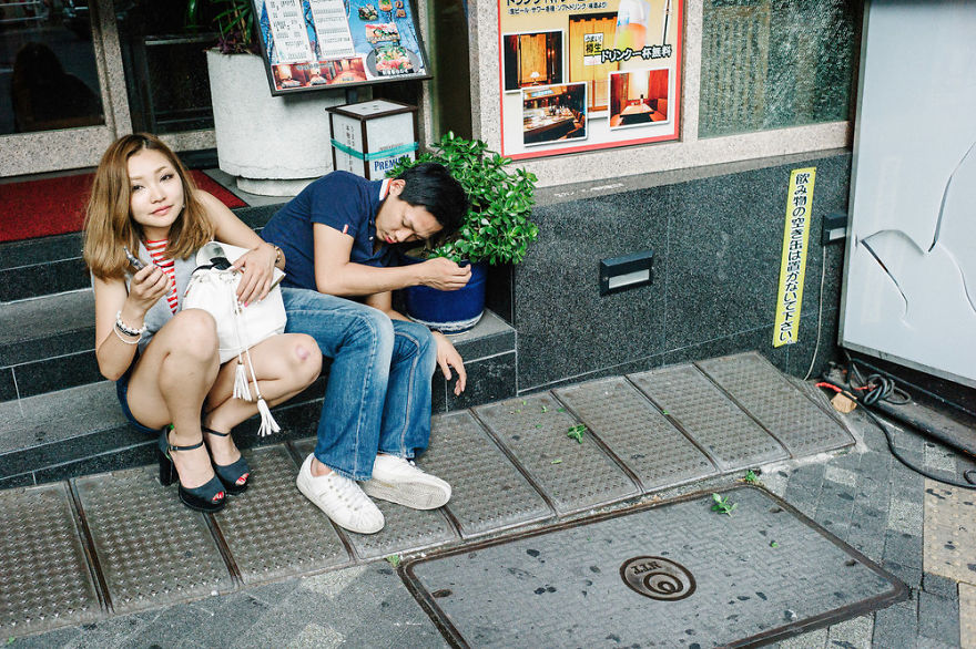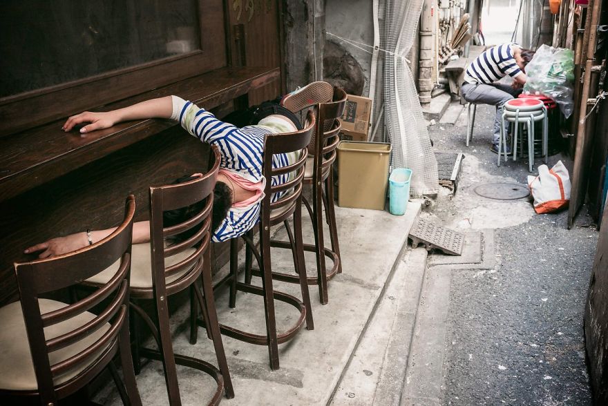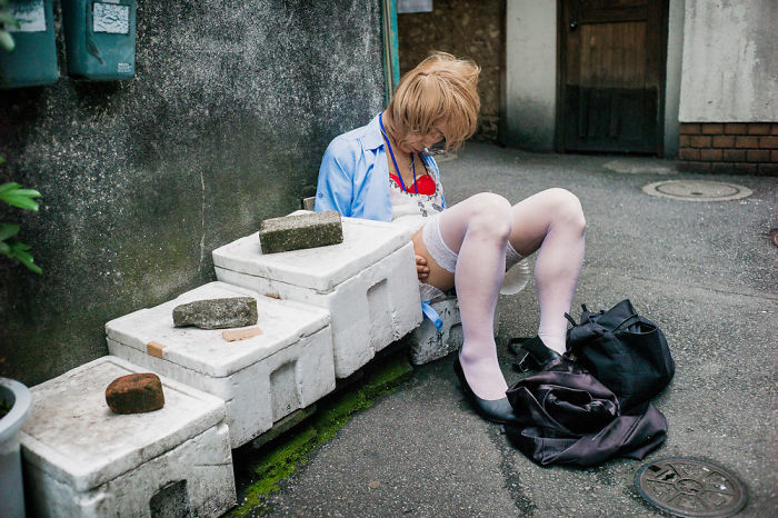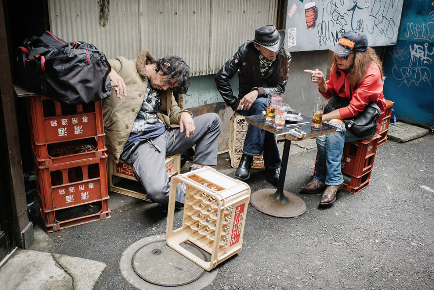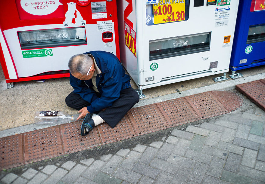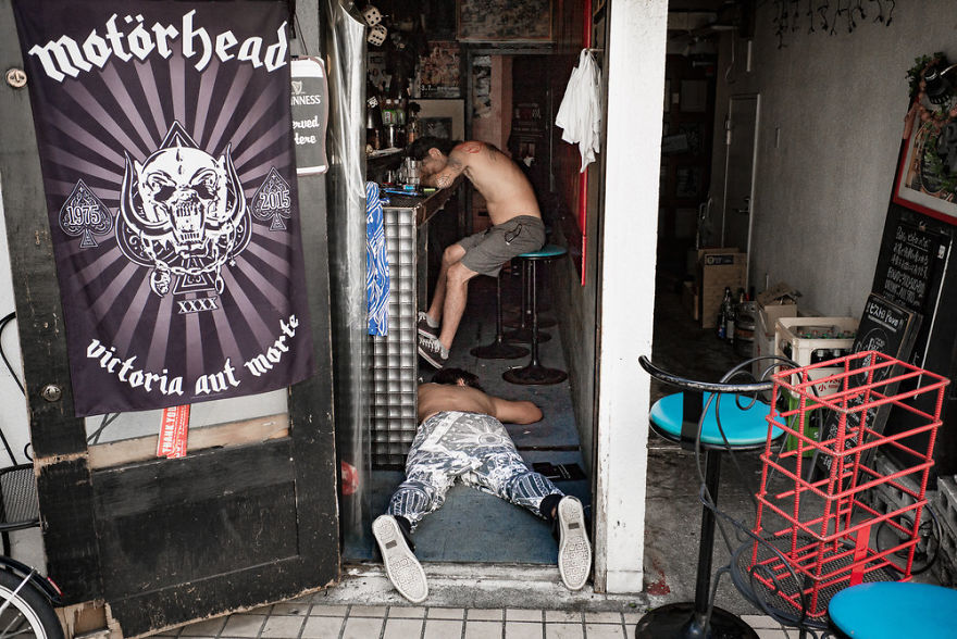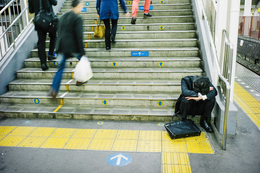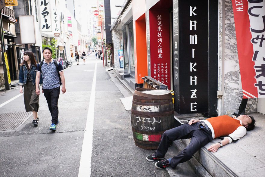 这些照片由摄影师Lee Chapman所摄,他来自英国曼彻斯特,1998年他来到东京,本来只准备“住上一两年”,却从此再未离开,他同时也是Tokyo Times网站的创始人。Lee Chapman的摄影作品揭示了日本生活的一角,但当人们谈及日本时,却很少有人会想到这些东西。我们看惯了照片上穿着五颜六色服装的coser和霓虹灯仙境,但是这些照片上在大白天瘫倒在街头或是在盆栽下打盹的醉鬼,却指引我们走进一个完全不同的世界。