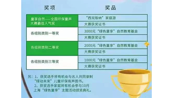 参赛宝贝不仅有机会获得“绿色童享”自然教育基金、西双版纳自然家庭之旅等“亲近自然”家庭大礼包,更有机会和名人共同录制“绿动未来”儿童环保图书!
