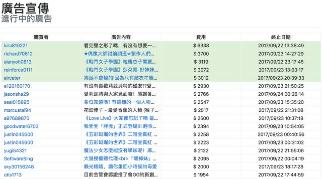 排名第一的投资人@kira810221 ,目前持有着《声之形》女主西宫硝子的64股股票。为了让他手中的股票能够进一步增值,TA花费了 $6338 的广告费让他所发布的信息,排在了广告板块的第一位: