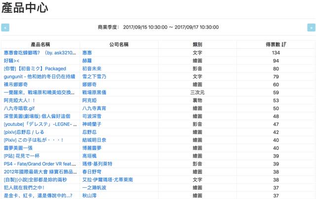 在长达2天时间的商业季度中,最受市场好评的产品,是来自惠惠(《为美好的世界献上祝福!》)公司出品的同人文,名字叫做《惠惠会吃蟑螂嗎?》,目前获得的票数是134票;而赫萝(《狼与香辛料》)公司出品的一张同人图、初音未来公司出品的《【初音ミク】Packaged (附中文字幕)》,则分列二、三位。