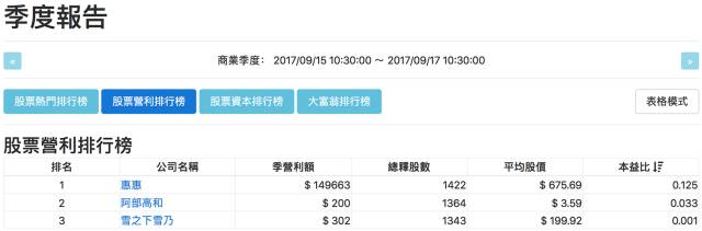在该股票交易平台的功能区中,我们可以轻松找到一个名为“季度报告”的页面,里面详细列出了“热门股票排行榜”、“股票盈利排行榜”、“股票资本排行榜”、“大富翁排行榜”这四个板块。