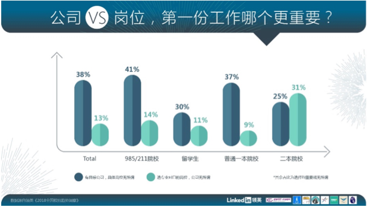 调研发现,95后在择业时十分看重雇主所能提供的平台如何。13%的受访者在校招中将专业对口的岗位作为首选,而38%的受访者表示更注重能进入理想公司而不在乎具体做什么,这一比例接近前者的三倍。985/211院校学生是最看重公司平台的群体,他们之中41%认为平台比岗位更重要,而在二本院校学生当中首选岗位的比例超过首选公司。