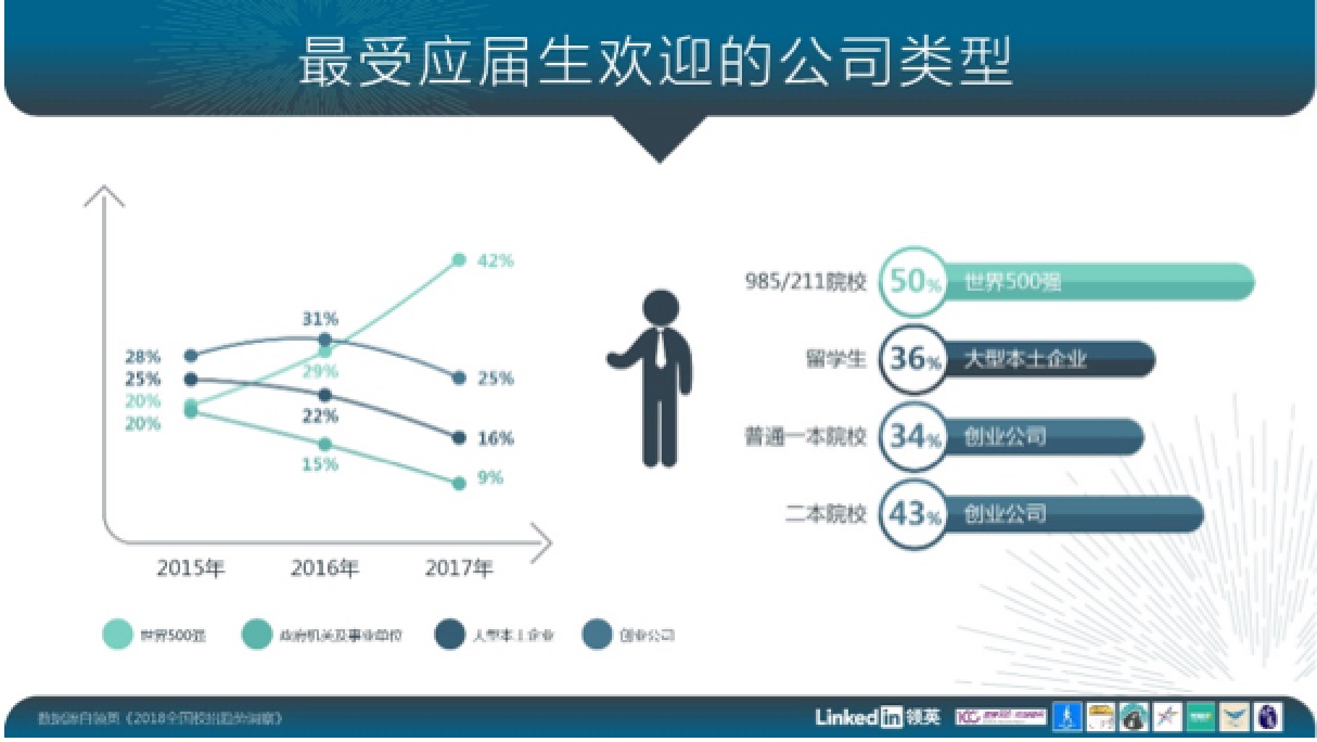 哪一类的公司最受应届生欢迎?领英报告指出,从2015年至今,世界500强公司的吸引力逐年上升,比例从2015年的20%激增至2017年的42%。创业公司的吸引力则在2016年的小幅上升后在2017年下降了6%至25%,这意味着应届生对创业的态度逐渐趋于理性。政府机关事业单位和大型本土公司的吸引力则在这三年中持续下降。
