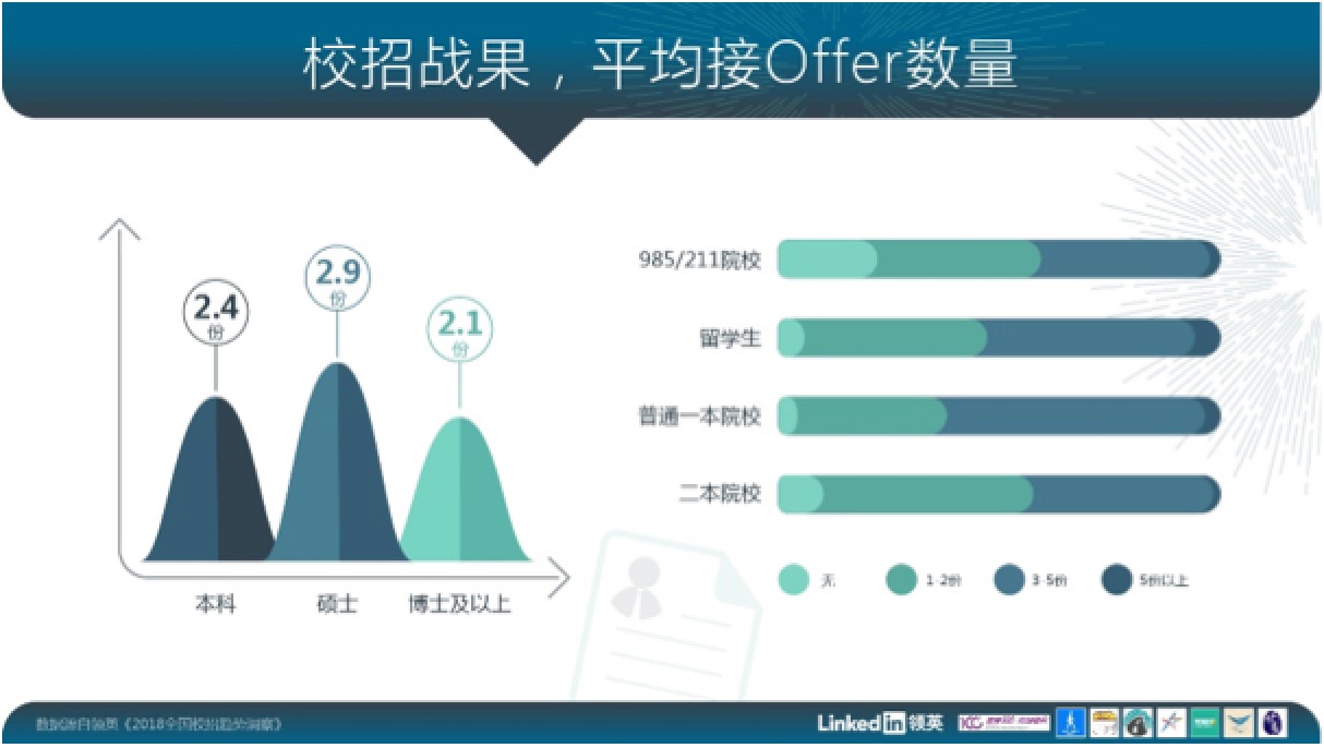 从offer数量来看,硕士生是最受雇主欢迎的——他们平均能收到2.9分简历,高于本科生的2.4份和博士生的2.1份。中国人力资源和社会保障部劳动工资研究所的调研发现,学历是显示求职者能力的重要信号,被用人单位普遍重视。领英调研再次验证了这一结果,一本学生的offer数量显著高于二本,然而有意思的是,毕业于985/211名校的学生当中反而有超过20%的没有收到任何offer。这意味着,名校毕业生有“眼高手低”的问题,没有很好地为激烈的求职竞争做好准备。另外值得注意的是,虽然“海归学历含金量下降”的说法越来越流行,但领英数据结果显示拿到5份以上offer最多的群体正是留学生。