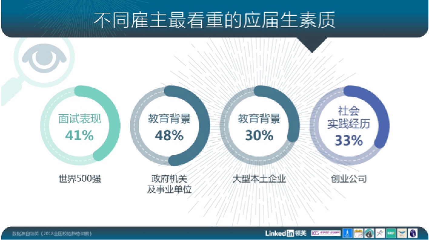 关于不同类型企业对应届生的评判标准,41%的世界500强企业HR表示最看重面试表现,政府机关事业单位和大型本土企业则表示更看重教育背景,约1/3创业公司更看重社会实践经历。