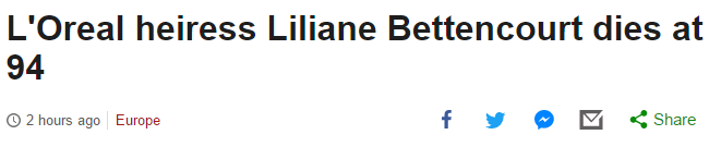 【世界第一女首富去世】化妆品公司欧莱雅的继承人贝当古(Liliane Bettencourt)周四被报道于家中去世,享年94岁。贝当古的家人确认了此事。欧莱雅公司由贝当古的父亲Eugène Schueller于1909年创立。2012年贝当古因阿兹海默症离开公司董事会。2017年她的财富估值400亿美元,为世界第一女首富。