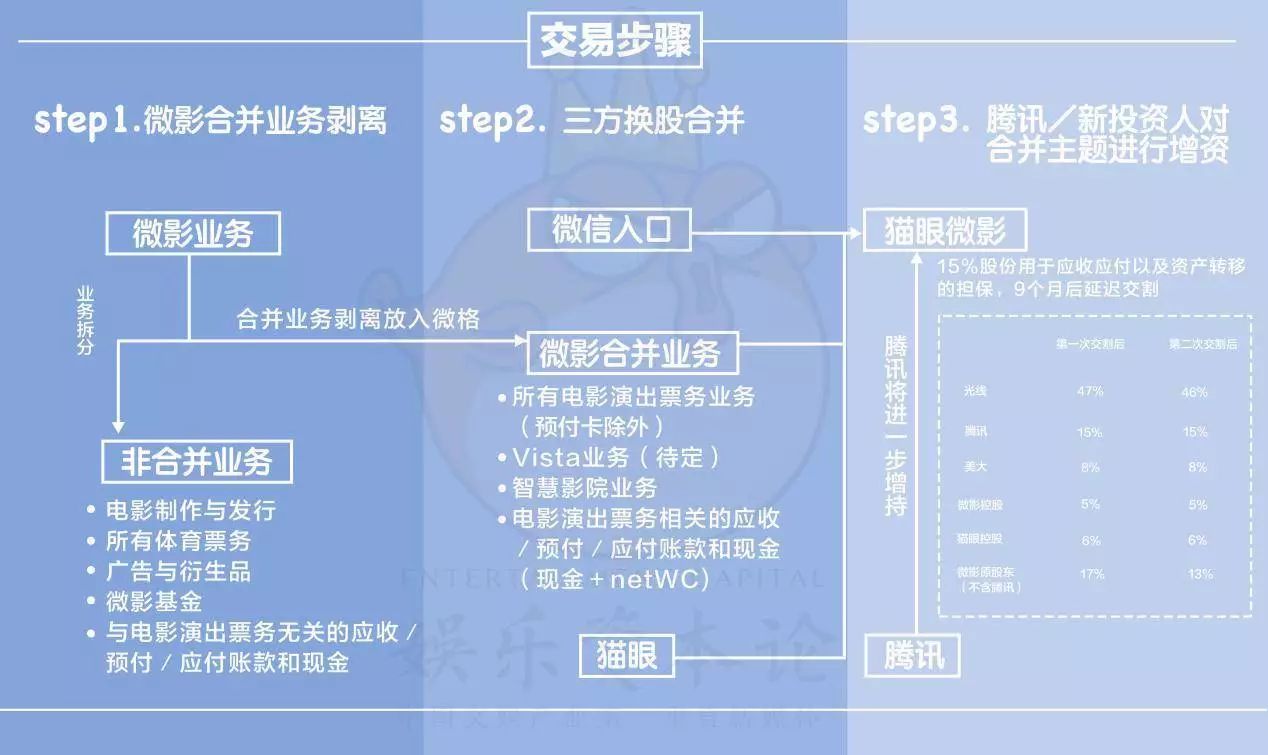 第二步是三方换股合并。一方是猫眼,另一方是微影剥离出来放入微格的业务包,还有一方是微信入口。