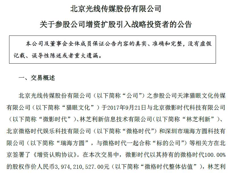 与此同时,光线传媒也在晚间发布公告披露详细交易方案,其控股的猫眼文化,与微影时代、林芝立新签署增资认购协议。
