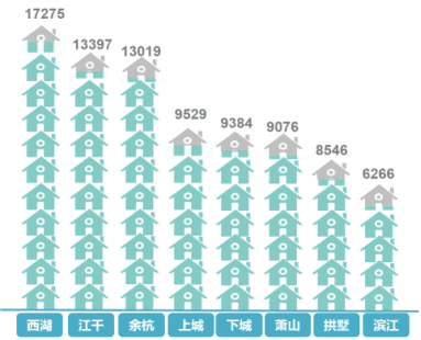 3大区域市值过万亿。杭州八区中,三大城区的住宅存量市值逾万亿,区域市值最高的西湖区逼近2万亿,市值遥遥领先,大西湖区不愧是地大物博!同样地域广袤的江干区和余杭区存量市值也均超越1.3万亿。