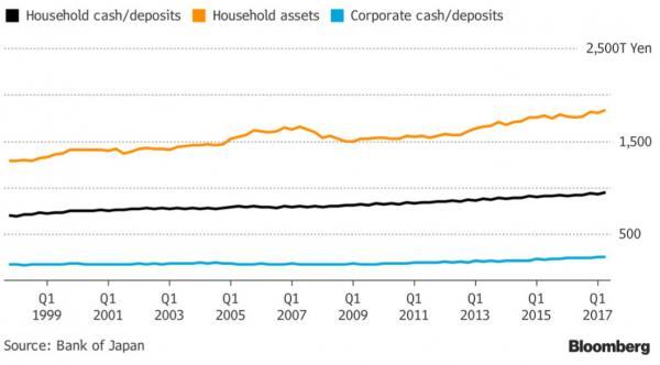 日本经济自2016年初以来渐有起色,截至今年第二季度,其国内生产总值(GDP)已连续六个季度扩张。不过,此前经济低迷期形成的“通缩思维”仍然深植于日本人心中,导致家庭和企业不愿消费和投资,而是大量持有现金和进行储蓄。