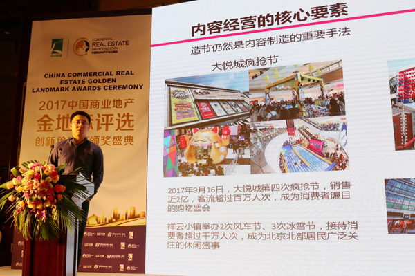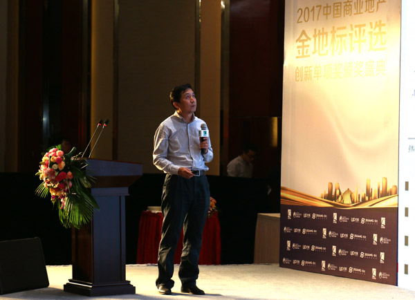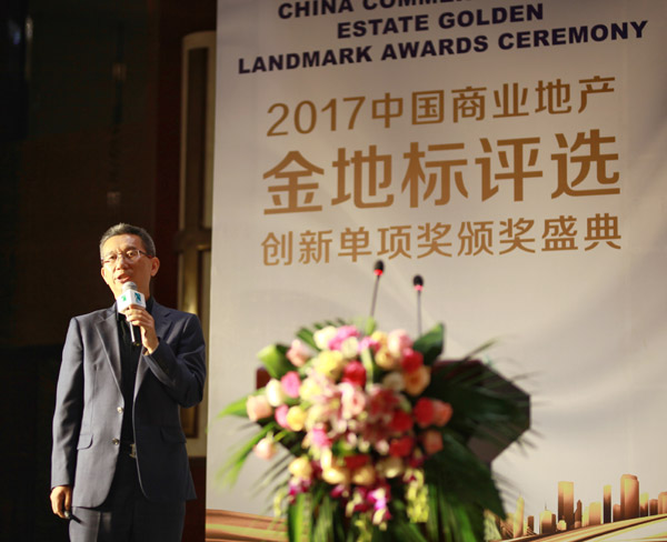 中经联盟商业地产专委会副主席、王府井百货集团发展部部长曹世斌为北京远洋未来广场颁发2017年商业地产金地标之IP化营销创新奖;