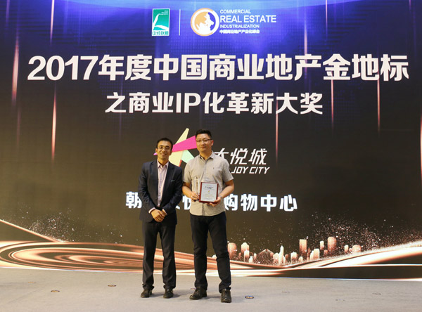 现场,特意赶来的中经联盟商业地产专委会副主席、万商俱乐部创始人杨泽轩专程为北京朝阳大悦城购物中心颁发2017年中国商业地产金地标之商业IP化革新大奖;