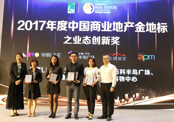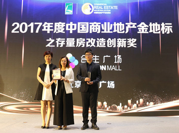 中经联盟常务理事、北京印力集团商业管理公司总经理张媛为北京朝阳合生汇2017年中国商业地产金地标之最受期待商业综合体奖;备受瞩目的北京合生广场则荣获2017年中国商业地产金地标之存量房改造创新奖的项目;