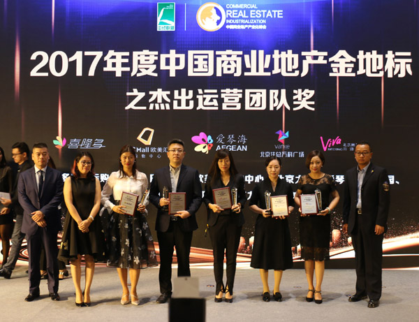中经联盟常务理事、金融街集团北京金石融景房地产开发有限公司副总经理胥佳媛;中经联盟商业地产专委会副主席、华夏幸福商业事业部运营中心总经理胡泊;中经联盟商业地产专委会新任副主席、华熙LIVE五棵松商管总经理马杰为喜隆多新国际购物中心、EC Mall欧美汇购物中心、北京太阳宫爱琴海购物公园、北京住总万科广场、北京富力广场购物中心颁发2017年中国商业地产金地标之杰出运营团队奖;