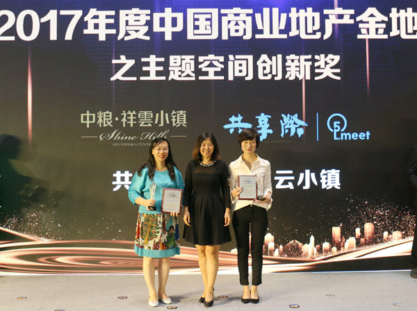 中经联盟商业地产专委会副主席、中粮地产北京副总经理客立宏为共享际、中粮祥云小镇颁发2017年中国商业地产金地标之主题空间创新奖;