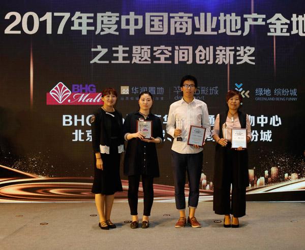 中经联盟商业地产专委会副主席、华夏幸福商业事业部招商中心总经理李敏为BHG Mall北京华联天通苑购物中心、北京华润五彩城、大兴绿地缤纷城颁发2017年中国商业地产金地标之主题空间创新奖;