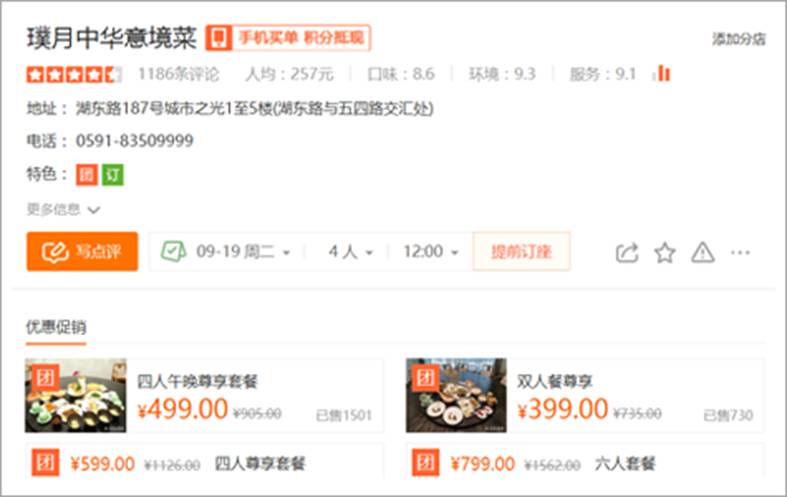 其中璞月中华意境菜,原价905元的四人尊享套餐,团购价499元;双人尊享套餐原价735元,团购399元。