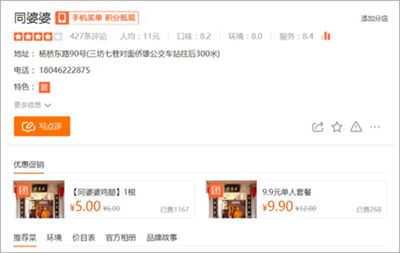 小吃人气排名第一的同婆婆,人均消费11元。一个6元的鸡腿,也有5元的团购价。