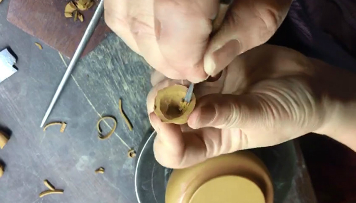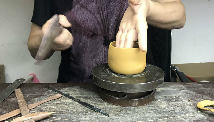 在制作过程中,必须在泥料干燥之前以最快的速度做完而且不能有过多的修整。否则在烧制时,所有的瑕疵将被加倍放大。也正因如此,朱泥壶做大壶的少,做小品的多,所容量300ml以上的罕见。