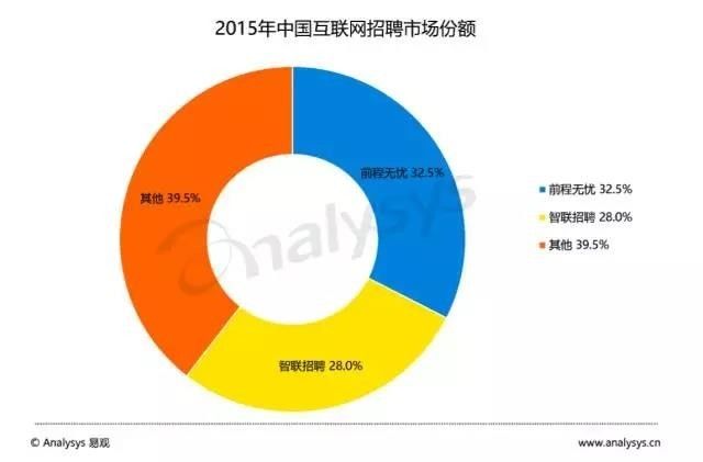 紧随其后的智联招聘,两者间的差距并不大。在易观千帆的统计报告中,2015年时,前途无忧占据市场32.5%的份额,智联招聘占据28%的份额,58同城与其他招聘平台则共同瓜分剩下的39.5%。