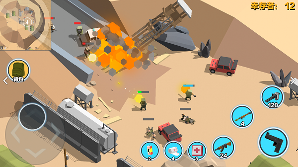 改良版本的代表是目前已经上线的《求生之王:大逃杀》。《求生之王:大逃杀》采取了45度俯视视角,游戏画面风格为像素卡通、色彩轻快艳丽,规避了写实风格易造成的人景混淆。类似于前段时间流行的io游戏《野蛮人大作战》,不过直观上看障碍物更多。