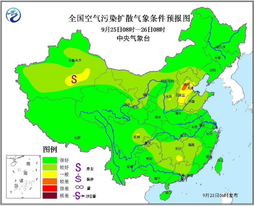 据中央气象台网站9月23日发布的环境气象公报,24日至26日白天,华北中南部大气扩散条件逐渐转差,将有轻度霾,局地中度霾。26日夜间起,受降水和冷空气共同影响,上述地区大气扩散和清除条件逐渐转好;全国其余大部地区大气扩散和清除条件较好。