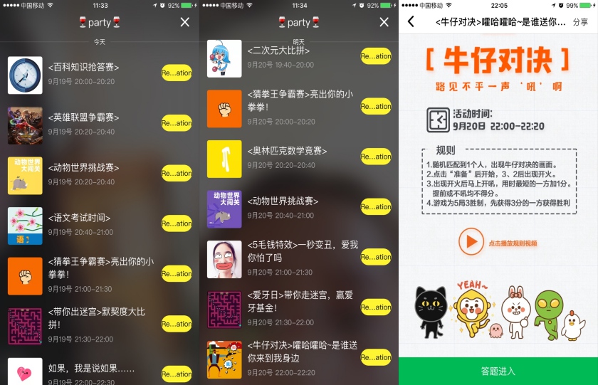 每个party持续20-30分钟,多半以“知识竞赛”的形式出现,涉猎二次元文化、语文常识、百科知识、数学题等等。报名party,在相应时段进入后,你就会被随机匹配到一位用户,由系统出题,两人进行抢答。不想烧脑的,还有石头剪子布之类的可以参加。