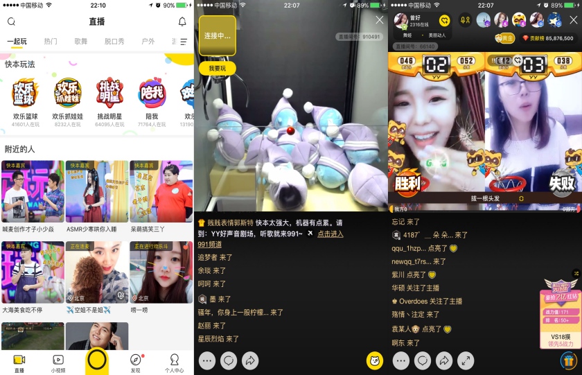 类似的活动在YY这样的直播平台上也能看见。YY最近推出了“一起玩”的板块,大概内容也是匹配用户一起玩游戏,比如投篮、抓娃娃,但稍有不同的是YY上的用户能够围观这场比赛。